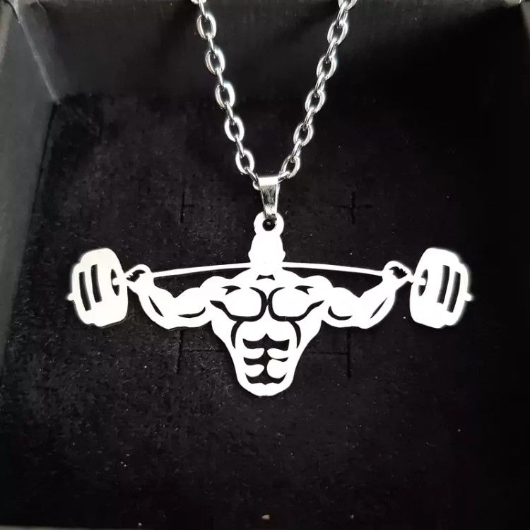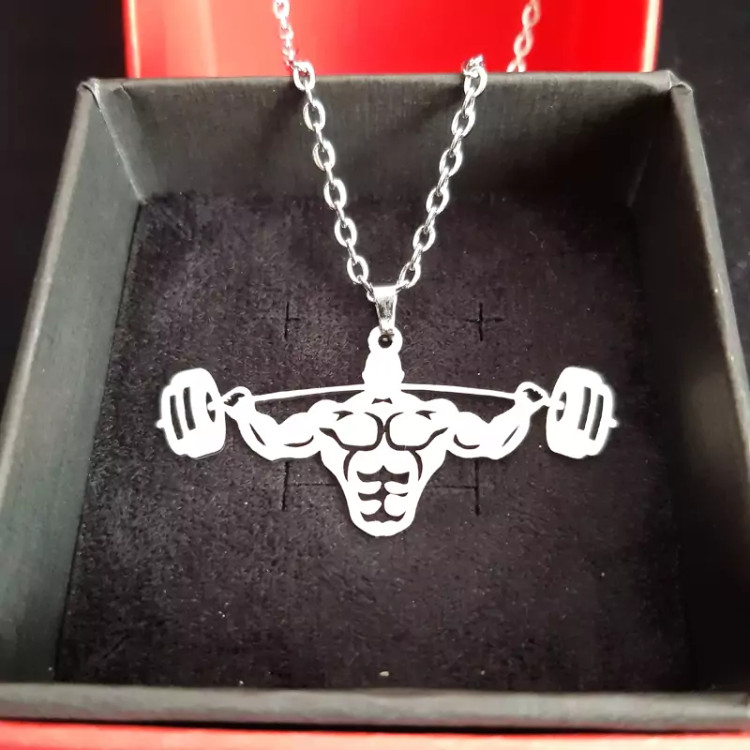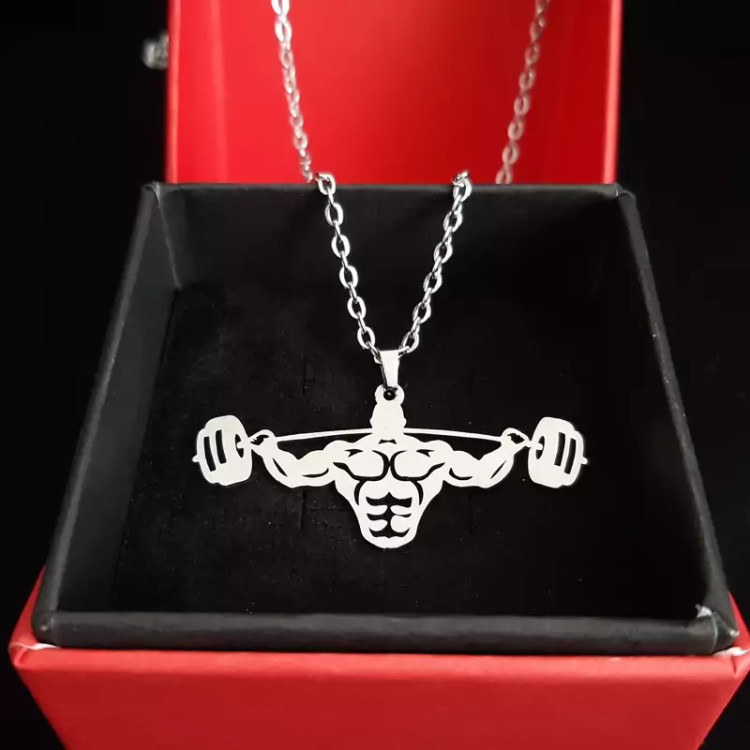 گردنبند مردانه استیل طرح بدنساز وزنه بردار نقره ای رنگ ثابت