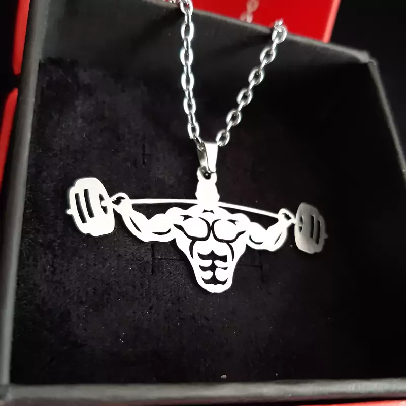گردنبند مردانه استیل طرح بدنساز وزنه بردار نقره ای رنگ ثابت